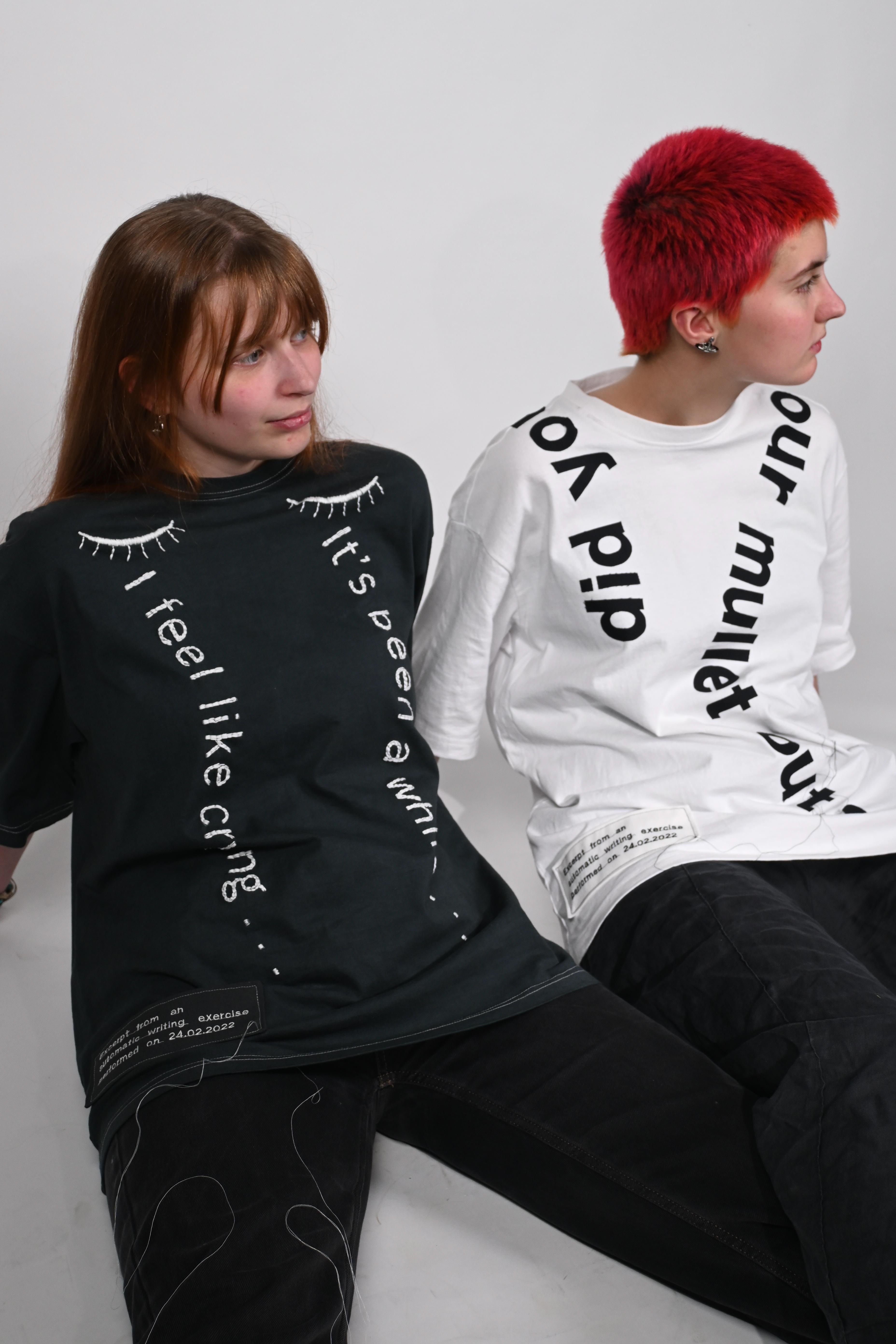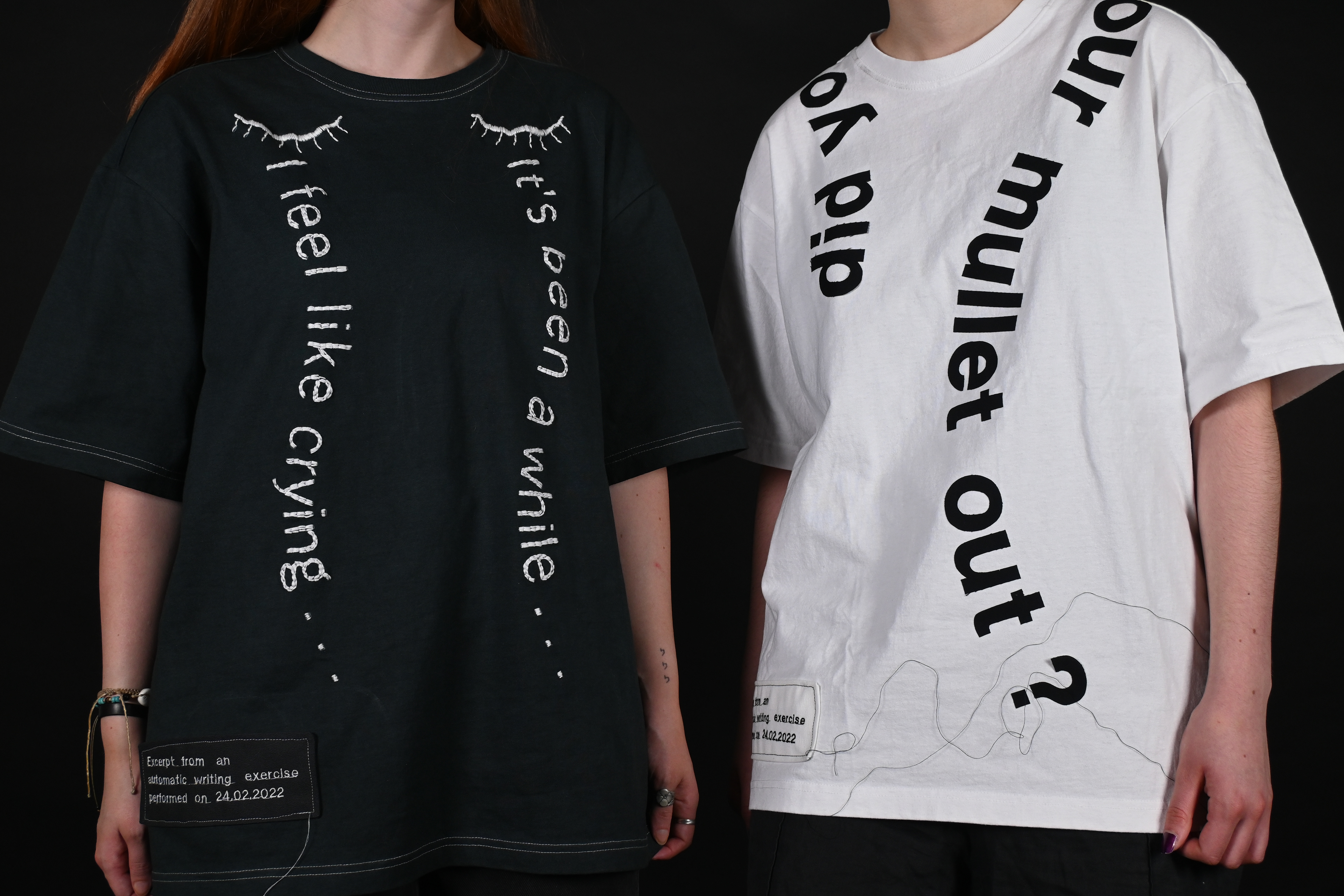 My partner and I started with an automatic writing exercise, we then each chose a sentence that stood out to us for our shirts and came up with an interesting design. My design is the white T-Shirt on the right.